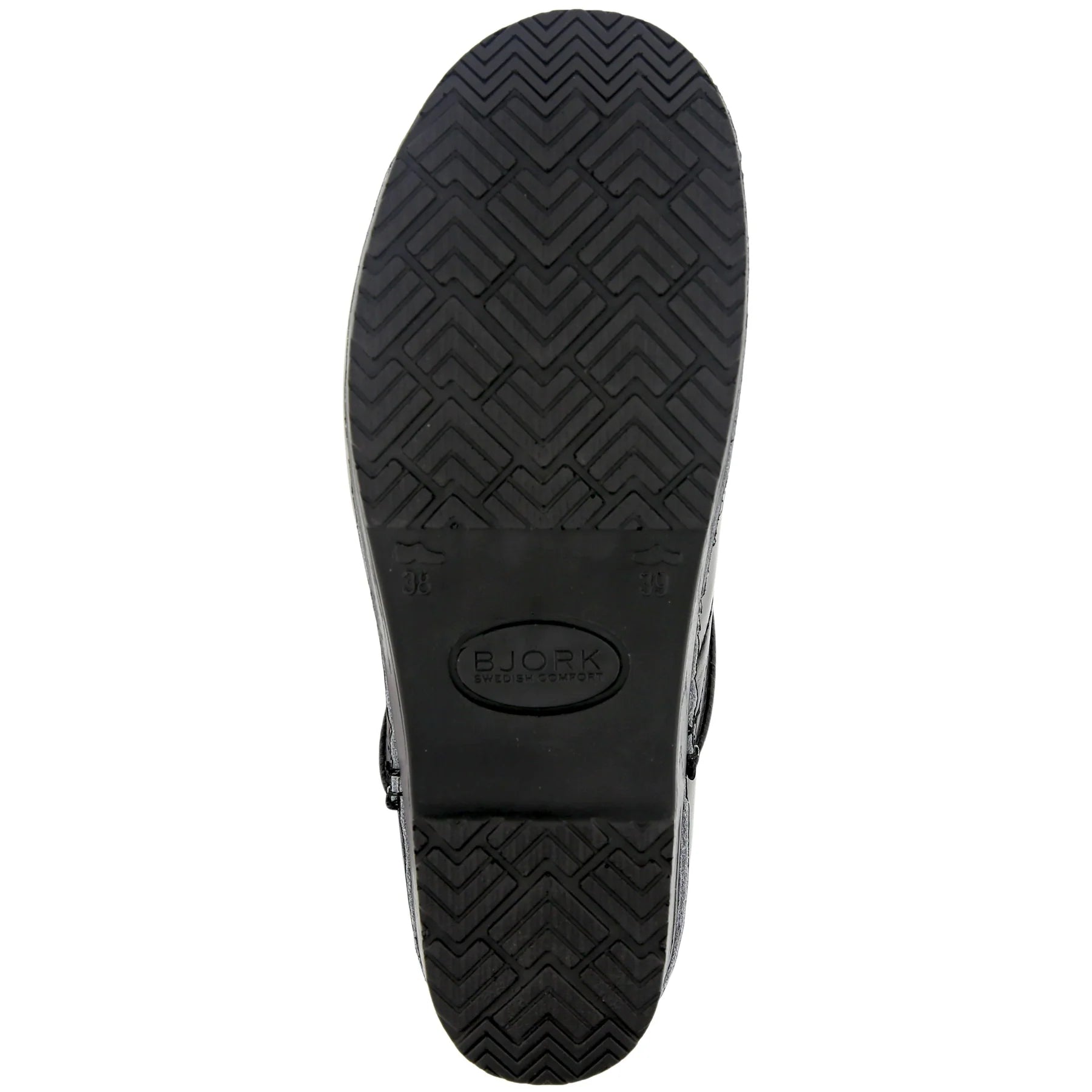 BJORK Splat open back Pro flexible printed leather clogs. Based on the classic yet functional Swedish clog silhouette, hand-made in Europe. It delivers all day comfort, thanks to its softer insole and arch support design.