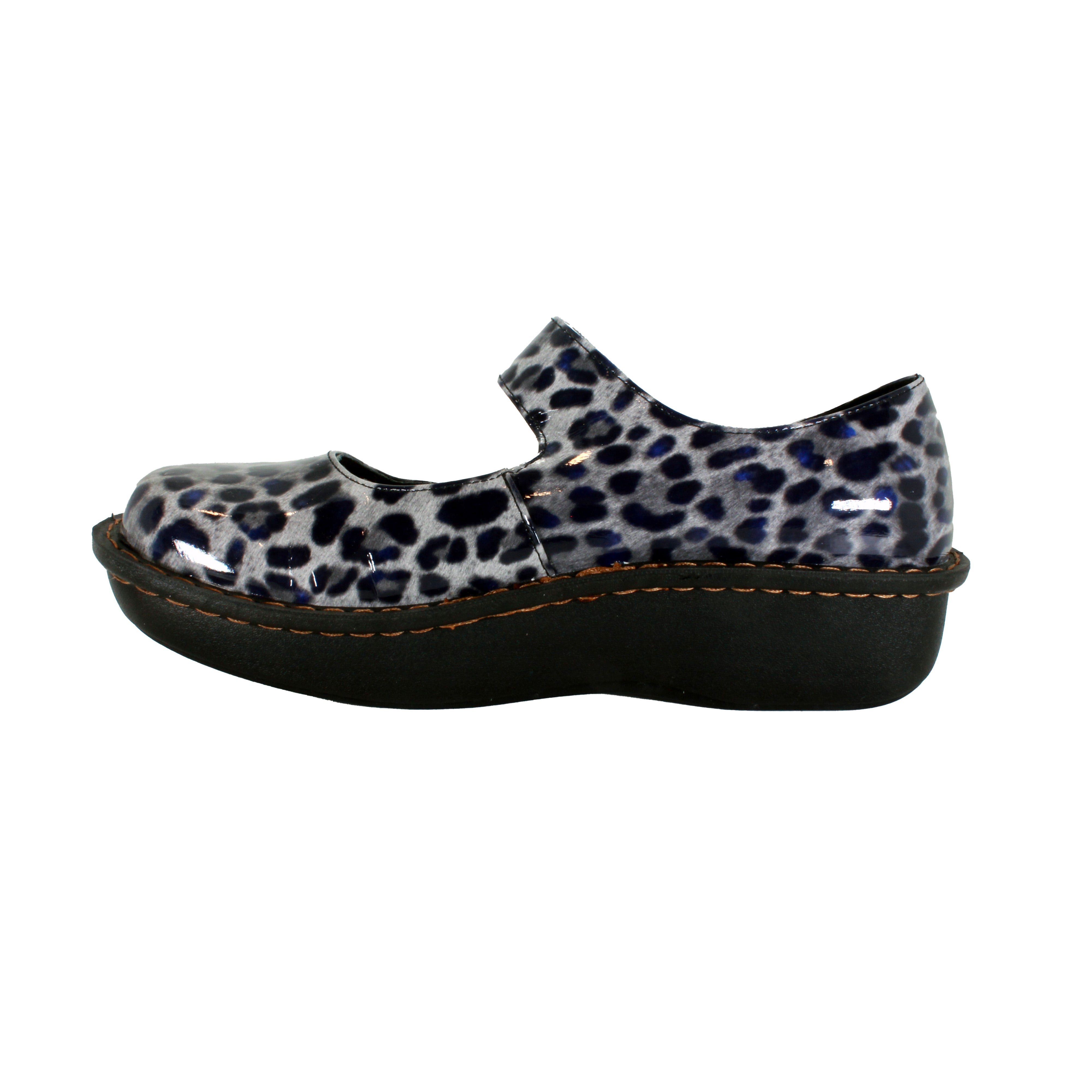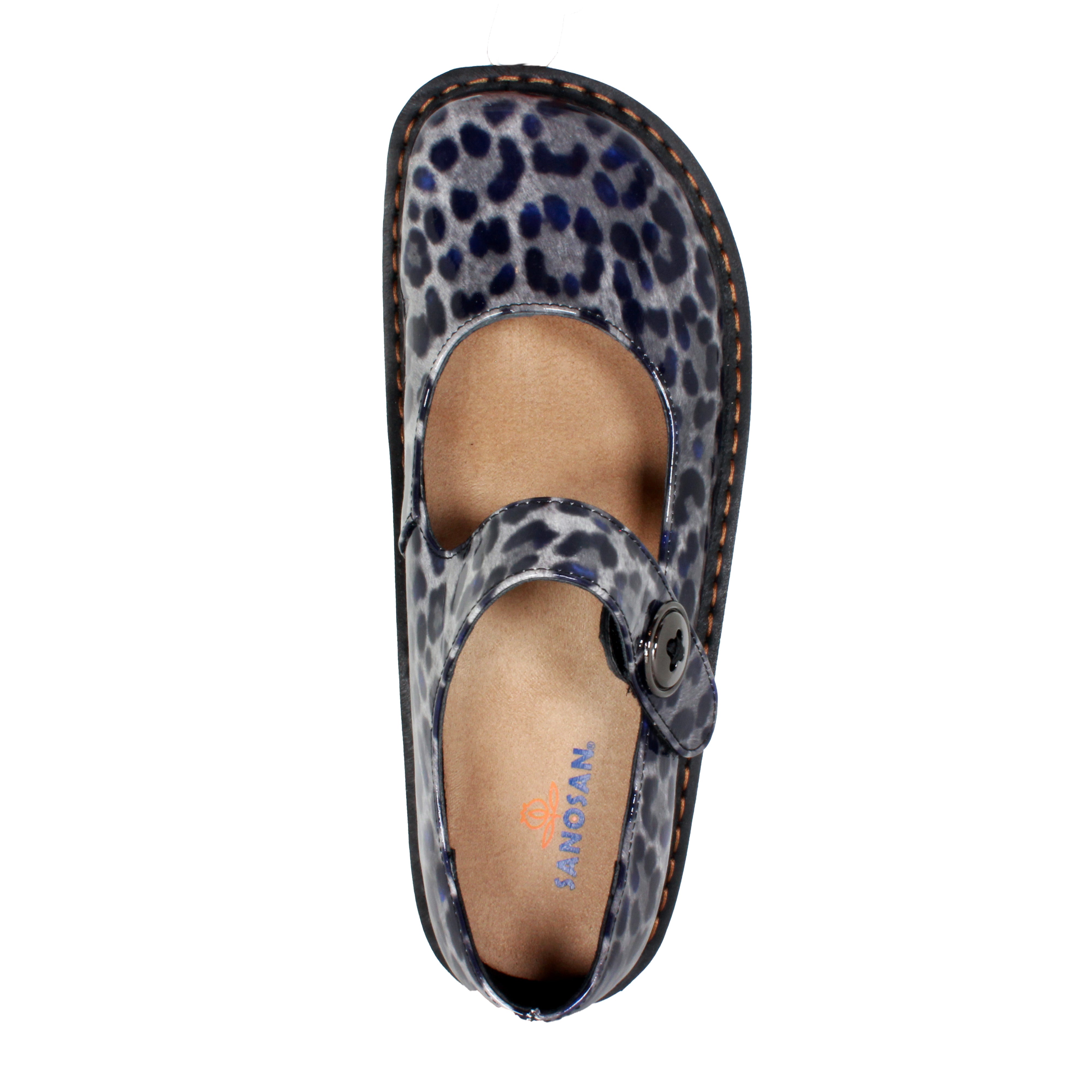 Step into stylish comfort with Sanosan Julia Comfort Mary-Jane Clogs. The adjustable Velcro strap, arch support, and removable ergonomic footbed provide ultimate comfort. The slip-resistant rubber outsole ensures safety while the Black Leopard patent adds a touch of elegance. The print has dark grey, black and under different light conditions, a hint of navy.