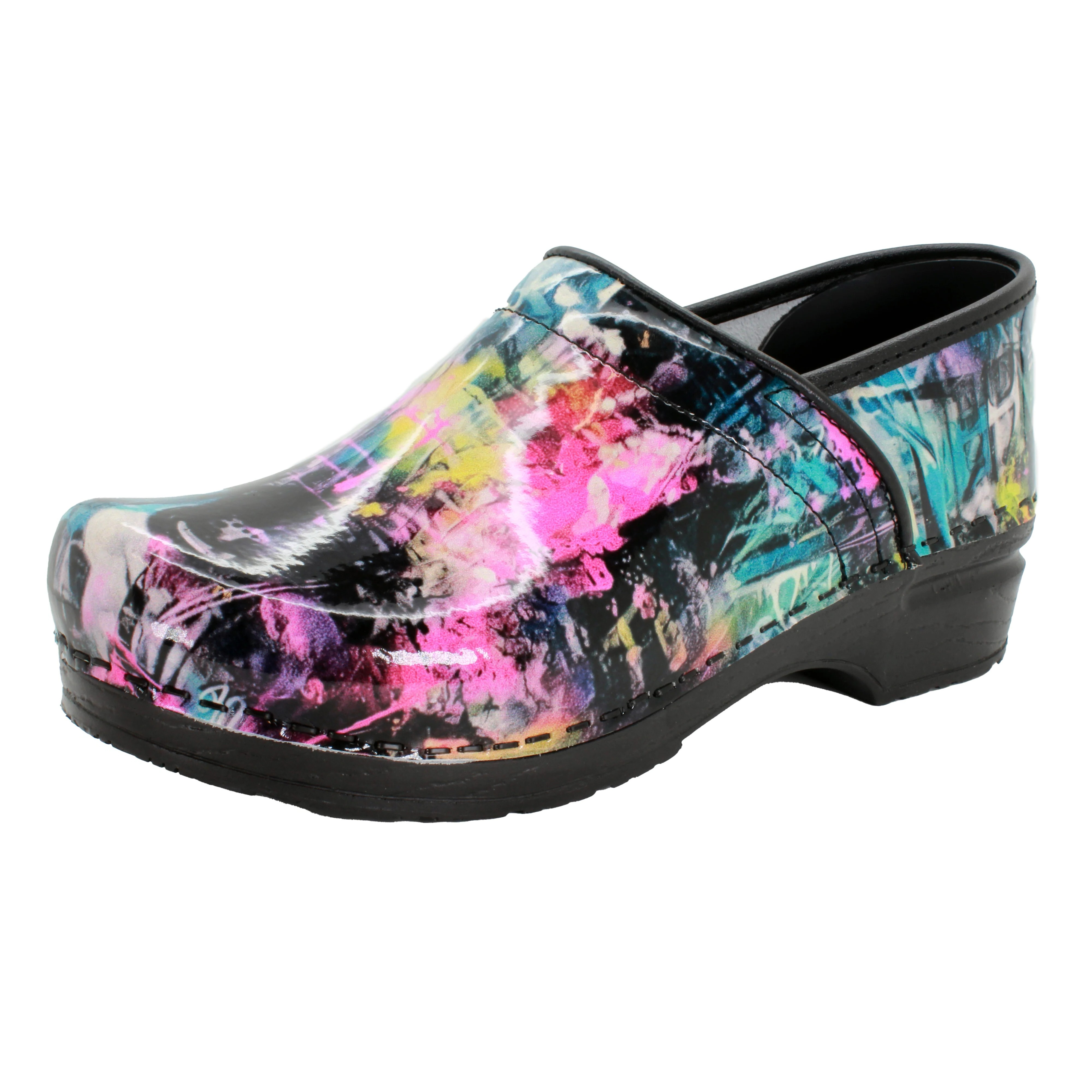 BJORK Professional Graffiti II leather clogs. Easy cleanable printed leather. The Professional clog is based on the classic yet functional Swedish clog silhouette, hand-made in Europe. It delivers all day comfort, thanks to its softer insole and arch support design.