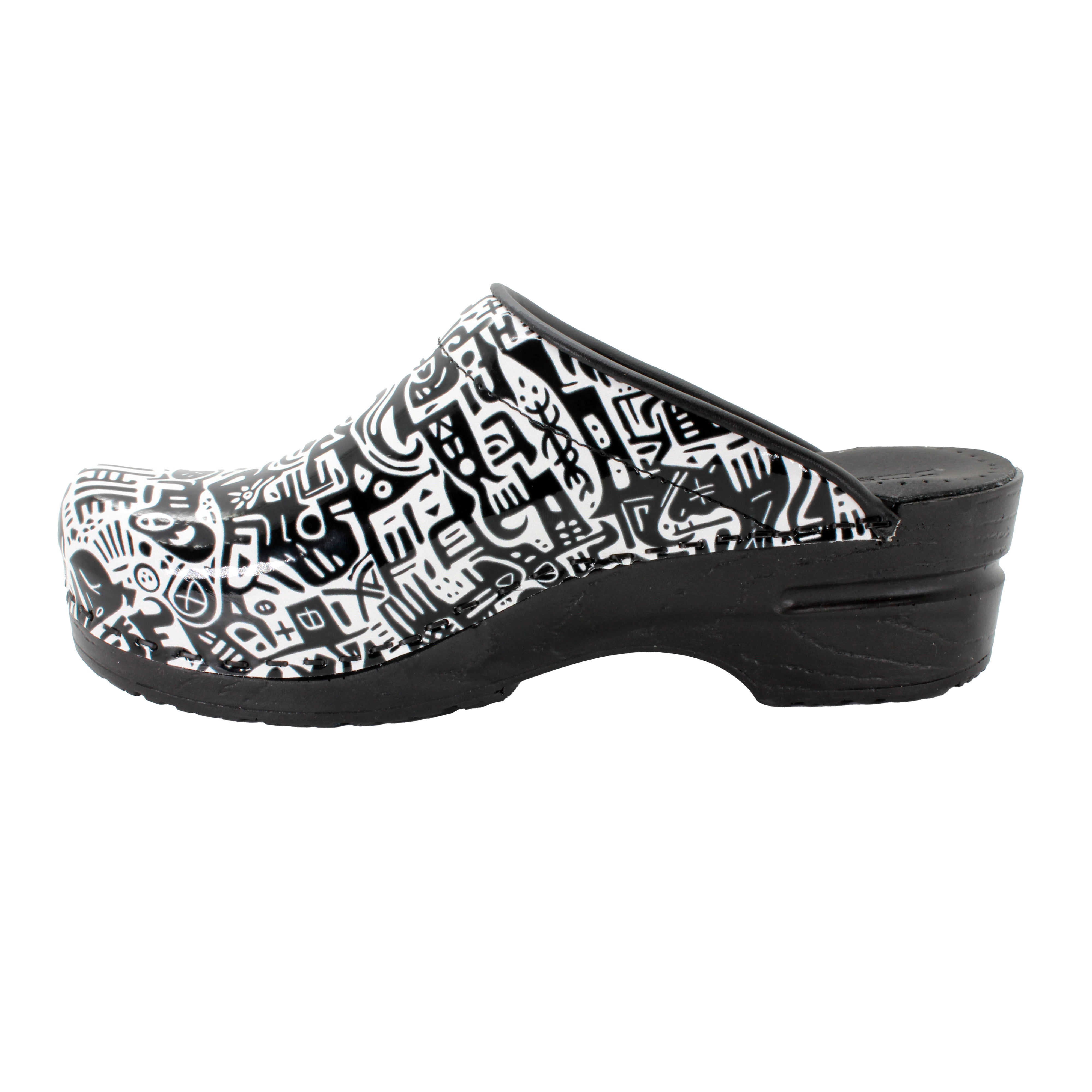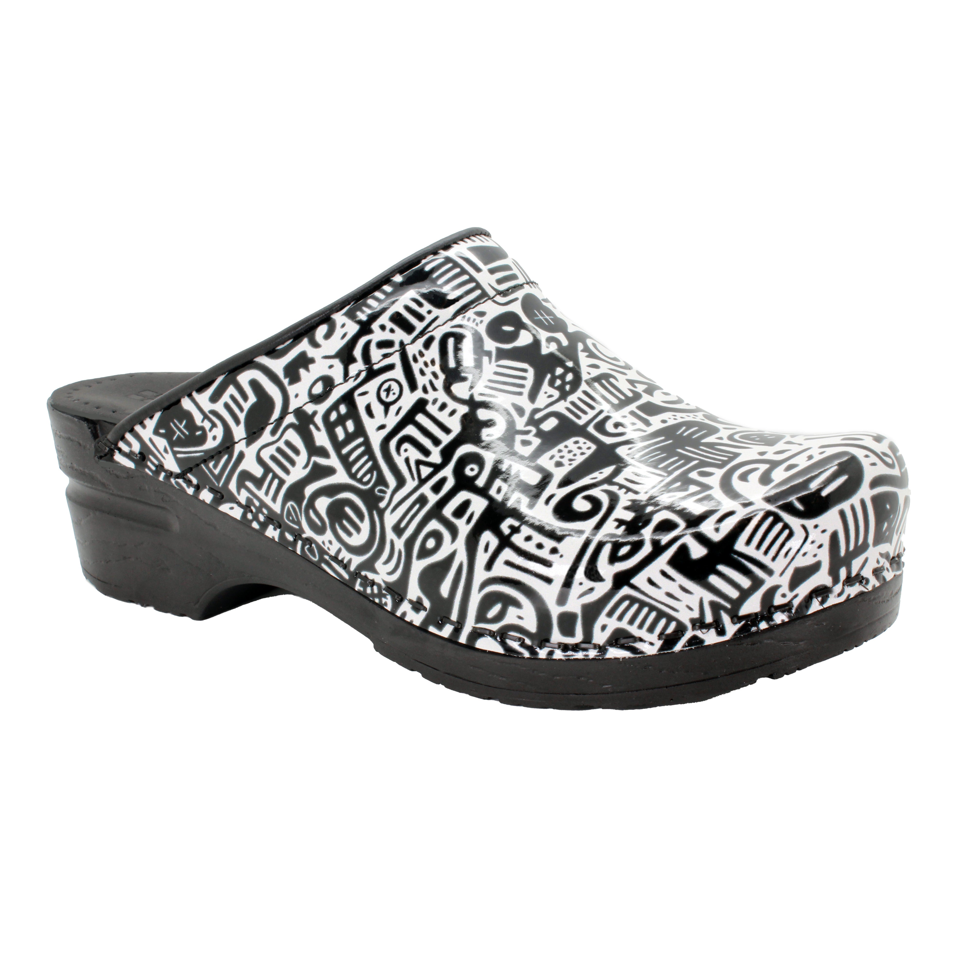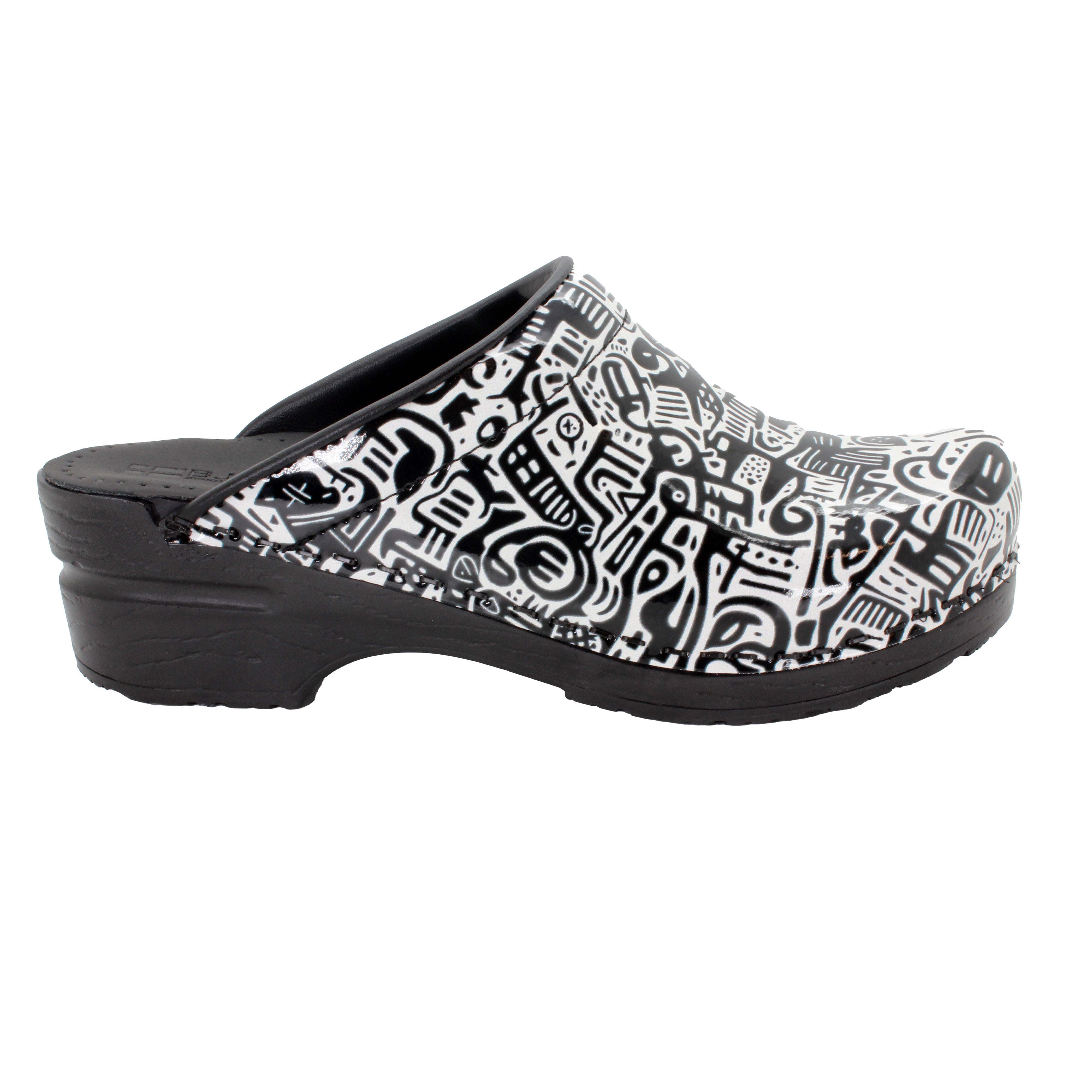 BJORK Juni open back Pro flexible printed leather clogs. Based on the classic yet functional Swedish clog silhouette, hand-made in Europe. It delivers all day comfort, thanks to its softer insole and arch support design.