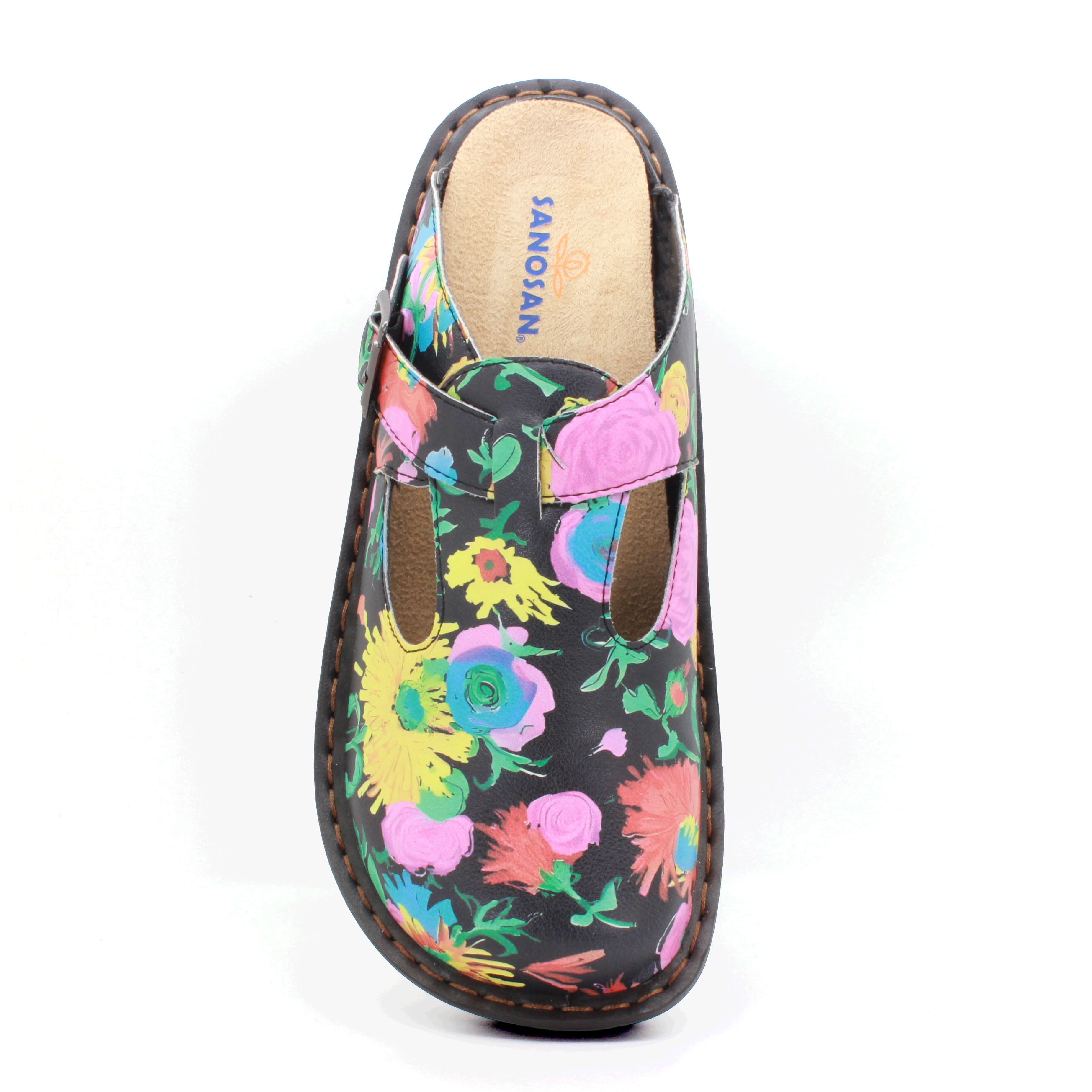 Experience ultimate comfort with the Sanosan Bella Slip-On Clogs featuring a Sunflower print. Designed for all-day comfort with integrated arch support and a removable ergonomic insole, these stylish clogs are perfect for everyday wear. The adjustable velcro strap with fake button ensures a custom fit while the slip-resistant sole keeps you steady on your feet.